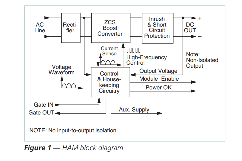 The HAM Figure 1, consists of a full-wave rectifier, a high-frequency zero-current switching (ZCS) boost converter, active inrush current limiting, short-circuit protection, control and housekeeping circuitry. The incoming AC line is rectified and fed to the boost converter. The control circuitry varies the operating frequency of the boost converter to maintain the output voltage of the HAM above the peak of the incoming line, while forcing the input current to follow the waveshape and phase of the line voltage. The AC input current follows the voltage waveform and a power factor better than 0.99 is achieved. Operating efficiency of the boost converter is optimized at any incoming line voltage by an adaptive output voltage control scheme.
